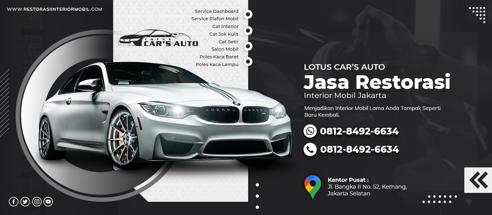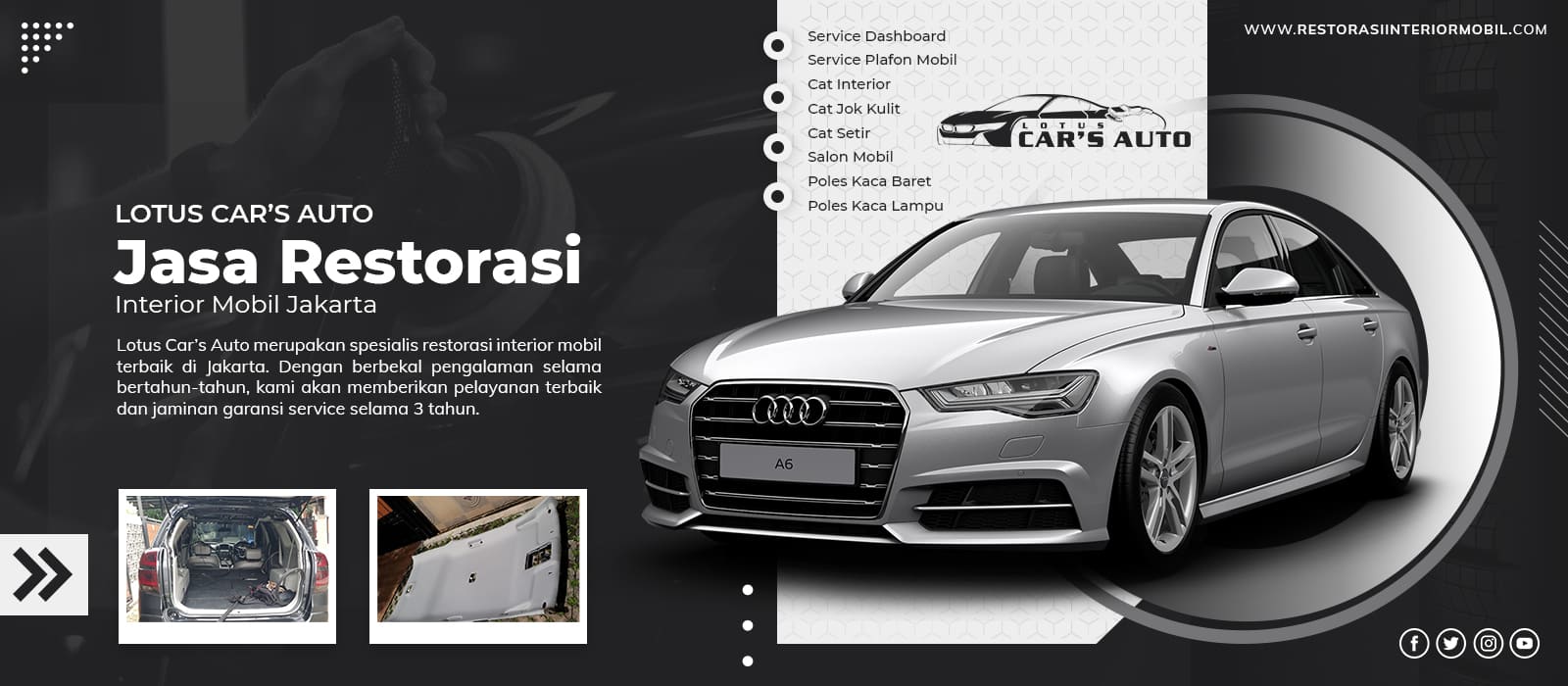 Lotus Car’s Auto merupakan perusahaan yang bergerak di bidang perawatan mobil, khususnya restorasi interior mobil. Kami siap melayani service dashboard, service plafon mobil, cat interior, cat jok kulit, cat setir, salon mobil, poles kaca dan lainnya dengan menggunakan bahan premium yang aman untuk kendaraan sehingga akan menghasilkan kualitas pekerjaan terbaik dan memuaskan.